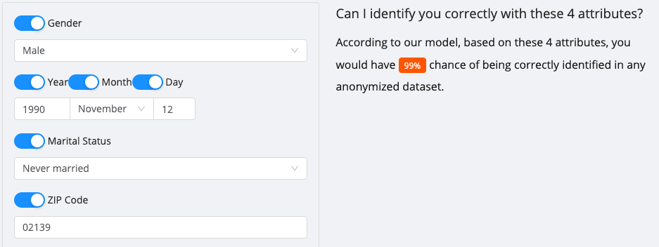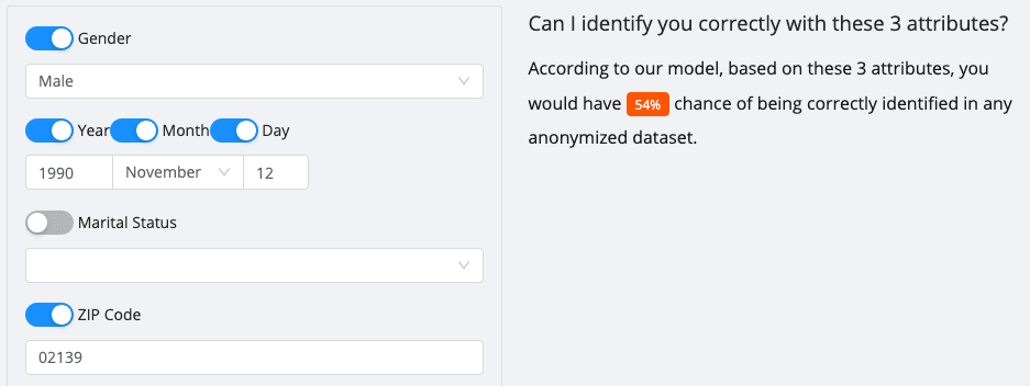 For instance, if you were a U.S. male born on November 12, 1990, and currently living in the 02139 ZIP code, there’s a 54% chance your employer or neighbor could identify you.