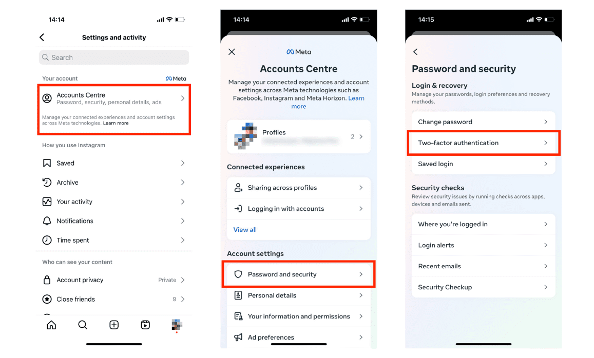 - Enable two-factor authentication (2FA): Doing this minimizes your risks in the event that someone does successfully phish you for account information. It adds an extra layer of security by requiring a second form of verification beyond just the password. Enable 2FA on your Instagram app from the settings menu: Tap your profile picture in the bottom right corner > three horizontal lines > Accounts Centre/Security > Passwords and security > Two-factor authentication > Choose Instagram (if you also have other accounts like Facebook) > Choose your method for 2FA (such as authentication app, SMS text or WhatsApp).