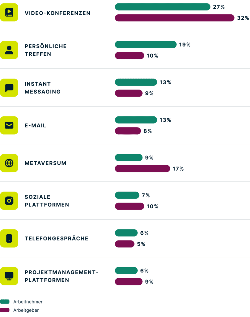 - Wer interessiert sich dafür? 77 % der Arbeitgeber bekundeten ihr Interesse an immersiven Arbeitsumgebungen wie dem Metaversum, verglichen mit nur 57 % der Arbeitnehmer. (Springen Sie zu diesem Bereich.)
