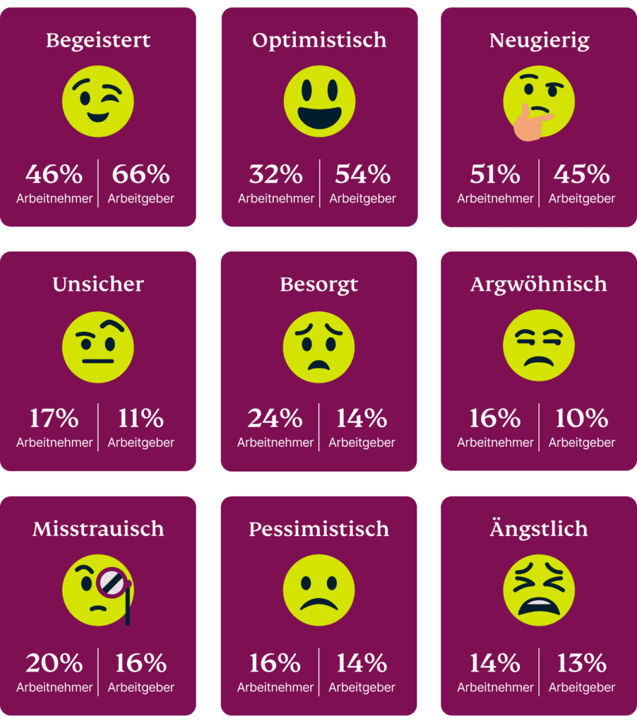 Arbeitgeber äußern sich viel eher begeistert, neugierig und optimistisch hinsichtlich der Aussicht auf ein Metaversum als Arbeitsplatz, während Arbeitnehmer eher besorgt und misstrauisch sind.