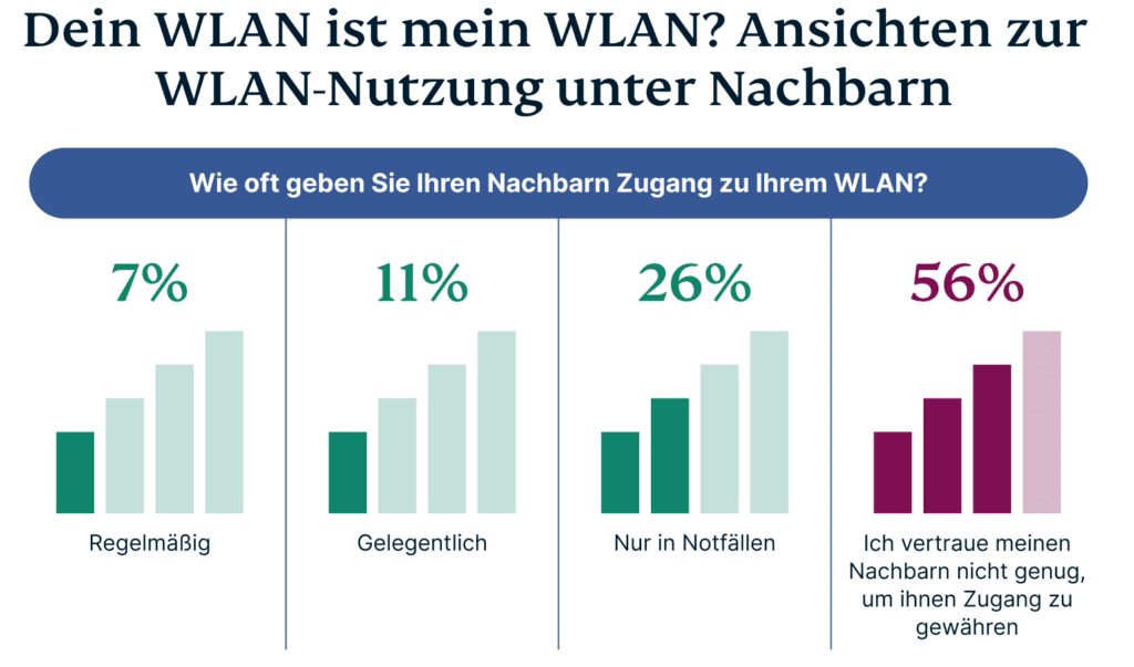 Die gemeinsame Nutzung des drahtlosen Internetzugangs mit Nachbarn oder anderen Menschen in der Nähe ist weniger verbreitet, auch wenn dies bei einem kleinen Anteil der Befragten (9 %) dennoch der Fall ist. Ironischerweise gab ein höherer Prozentsatz der Befragten (23 %) zu, ihre Nachbarn nach deren WLAN-Passwort zu fragen. Zu den am häufigsten genannten Gründen für diese Anfragen gehören vorübergehende Internetprobleme (15 %) oder eine dringende Notwendigkeit, ins Internet zu kommen (8 %).
