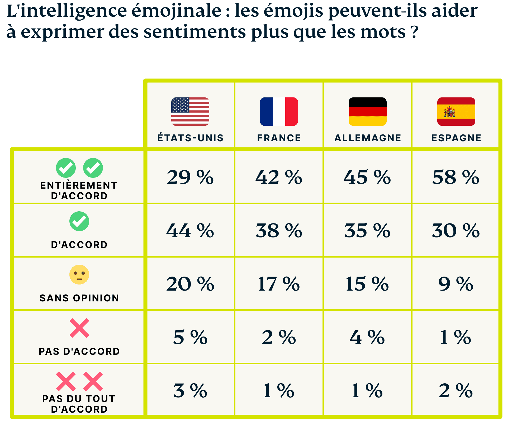 Plus de la moitié (78 %) des Français interrogés affirment ne pas croire que les émojis adoucissent l'annonce d'une mauvaise nouvelle, une opinion bien plus répandue qu’au État-Unis, en Allemagne ou en Espagne. Cependant, plus de la moitié des personnes interrogées déclarent avoir utilisé des émojis pour ne pas révéler leurs sentiments.