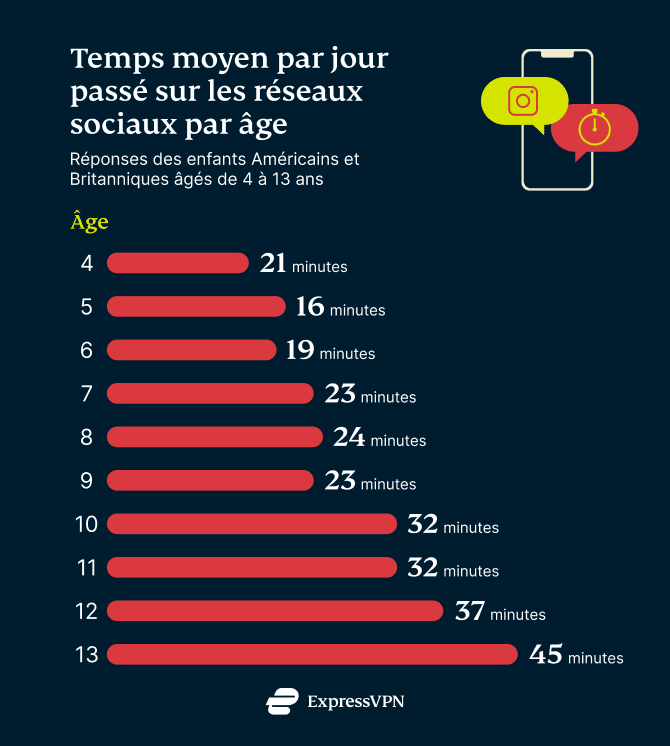 Si TikTok, Instagram et Facebook étaient des établissements publics, la plupart des parents ne laisseraient pas leurs enfants s'y rendre seuls. La majorité des plateformes de réseaux sociaux exigent que leurs utilisateurs aient plus de 13 ans (en raison des lois interdisant aux entreprises de collecter des données relatives aux enfants). Dans cette enquête menée par ExpressVPN, nous avons interrogé des enfants âgés d'à peine 4 ans qui fréquentent chaque jour les réseaux sociaux.