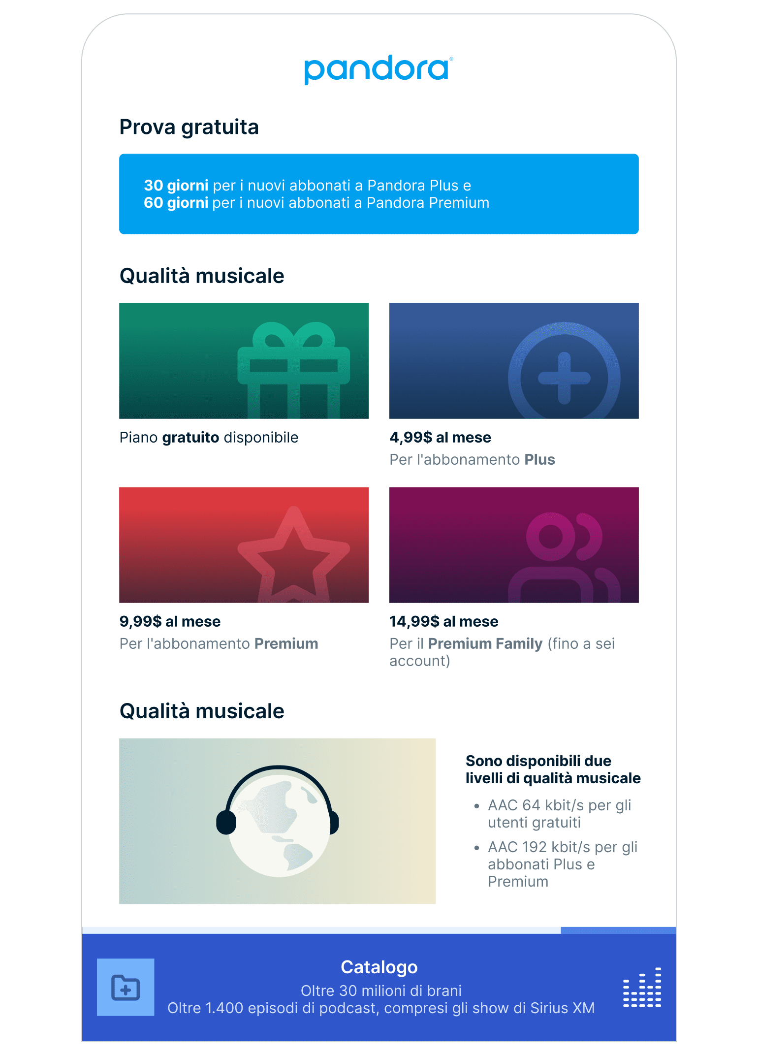 - Altre piattaforme come Deezer, Tidal e Pandora hanno offerte e prezzi diversi, che si concentrano sulla scoperta della musica e sull'audio di alta qualità.