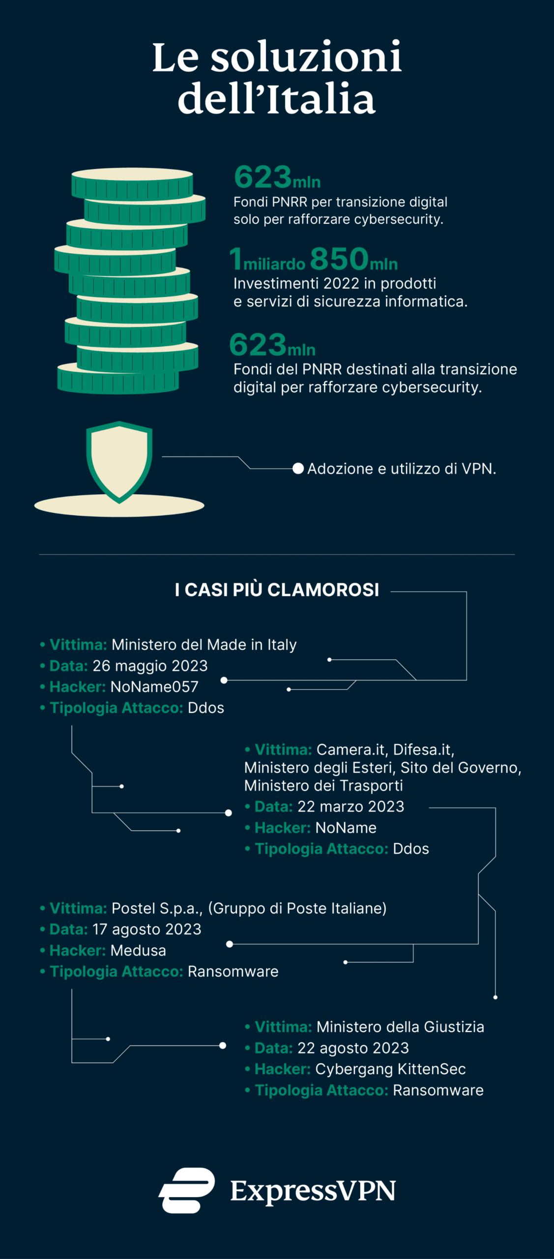 Pare chiaro dunque che l’Italia sia ormai entrata a pieno titolo, almeno come bersaglio, nella guerra cibernetica diffusa. Davanti alla nuova sfida il Governo ha stanziato una serie di risposte, possibili soluzioni all’inedito problema. La strategia consiste nell’aumentare i fondi destinati alla crescita digitale e alla cybersecurity:  ecco dunque che 623 milioni dei fondi previsti dal PNRR saranno utilizzati solo per rafforzare la sicurezza cibernetica, mentre un altro miliardo e 850mila euro è stato speso nel 2022 in investimenti per prodotti e servizi informatici. Al di là del vil denaro, l’Italia sta comunque adottando anche alcuni provvedimenti strategici, come l’utilizzo di VPN, add something else also here, what other solutions, tips and tricks for normal users.