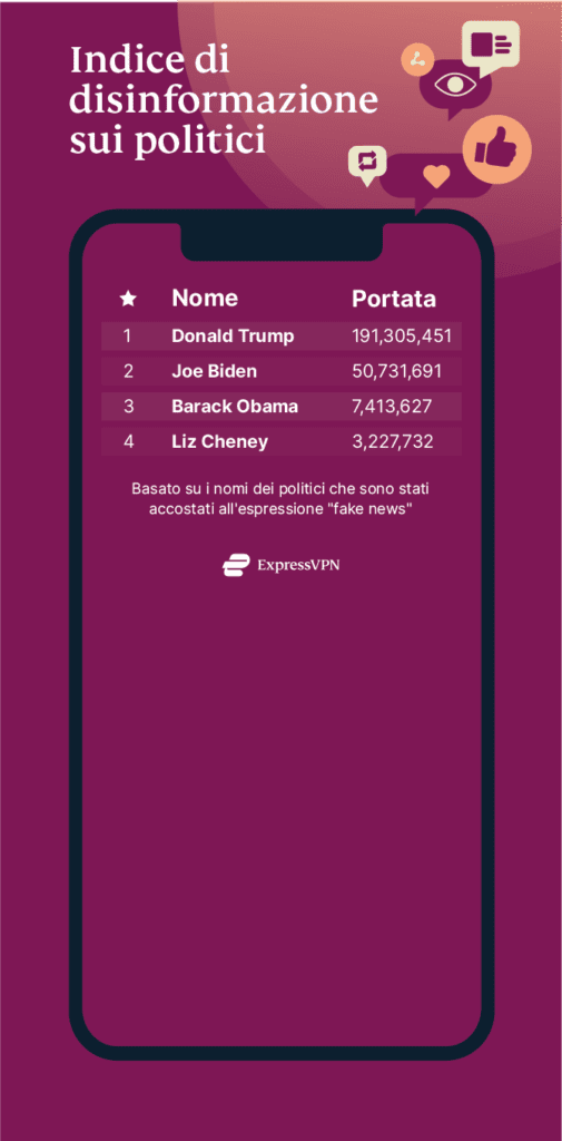 Donald Trump ha probabilmente reso popolare il concetto di fake news durante la sua presidenza, quindi non dovrebbe sorprendere che sia in cima alla nostra lista di politici che sono maggiormente associati a questo termine. La ricerca mostra che 191.305.451 persone si sono imbattute in post di questo tipo incentrati sull'ex presidente.