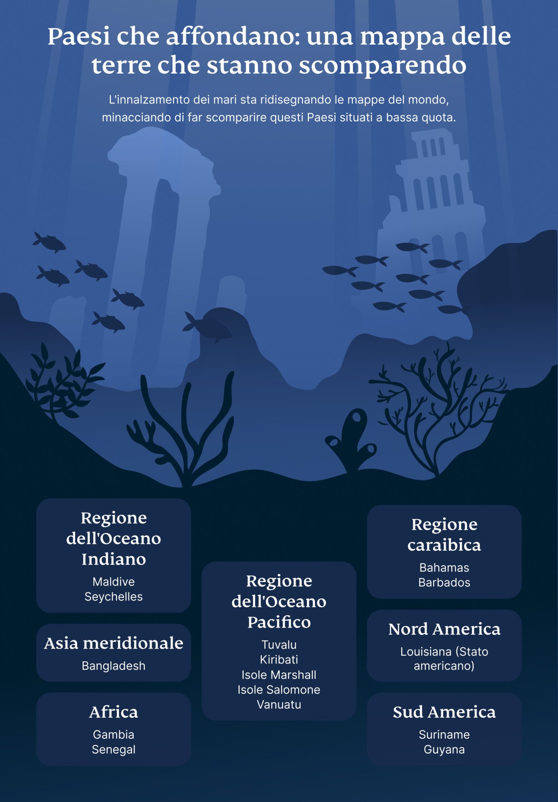 Per molte regioni costiere e insulari, l’oceano è sempre stato una fonte di vita—alimentando le economie, plasmando le culture e connettendo le comunità. Ma ora rischia di portare via tutto. Paesi come Tuvalu, le Maldive e Kiribati sono tra i più vulnerabili. E non sono i soli. In tutto il mondo, aree ad altitudini basse—dagli atolli dell’Oceano Pacifico e Indiano alle zone del Bangladesh e della Louisiana—affrontano il rischio di scomparire sotto le onde.