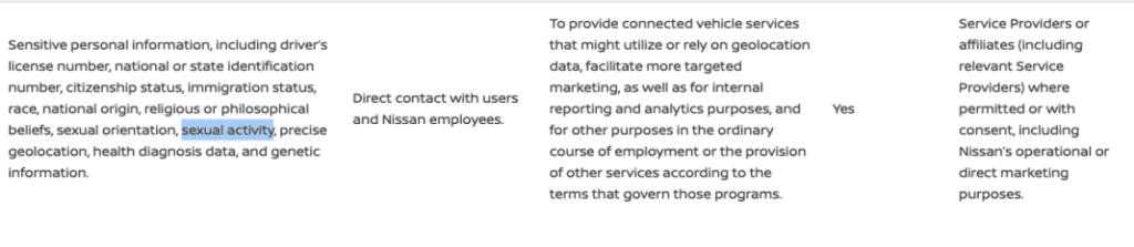そして、コネクテッドカーメーカーはこれで満足するつもりはありません。外部のデータソースを通じてさらに一歩踏み込み、収入、在留資格、人種、さらには(冗談抜きで)性行為や遺伝情報のようなごくごく個人的な情報まで掘り下げます。プライバシー設定で許可されている場合は、写真、カレンダー、ToDoリストにもアクセスできます。