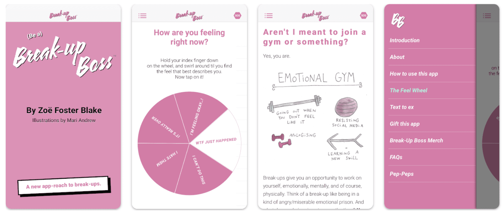 연애 작가인 조에 포스터 블레이크의 아이디어로 탄생한 Break-up Boss는 이별을 겪고 있는 사람들에게 기댈 어깨를 내어줍니다. 이 앱은 실용적인 조언, 긍정, 심지어 치료용 게임(예: 가짜 메시지를 전 연인에게 전송하기) 등의 기능으로 가득 찬 이별 후 자립 안내서라고 생각하시면 됩니다.