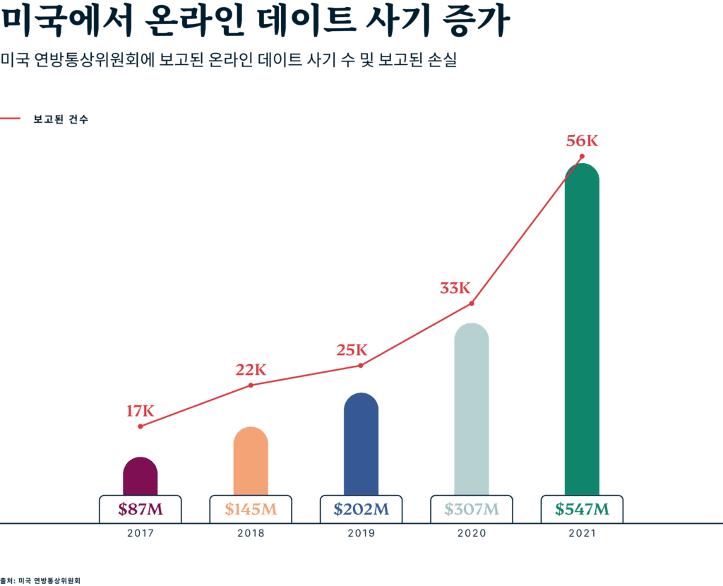 실제로 미국 연방거래위원회(FTC)가 발표한 로맨스 스캠 보고서에 따르면 2021년, 한 해에만 데이트 사기꾼에게 잃은 손실만 미화 약 5억 4,700만 달러인 것으로 나타났습니다. 이 수치는 전년 대비 80% 증가했으며 더 많은 사용자가 온라인 데이트 사이트에 가입함에 따라 급증할 것으로 예상됩니다.