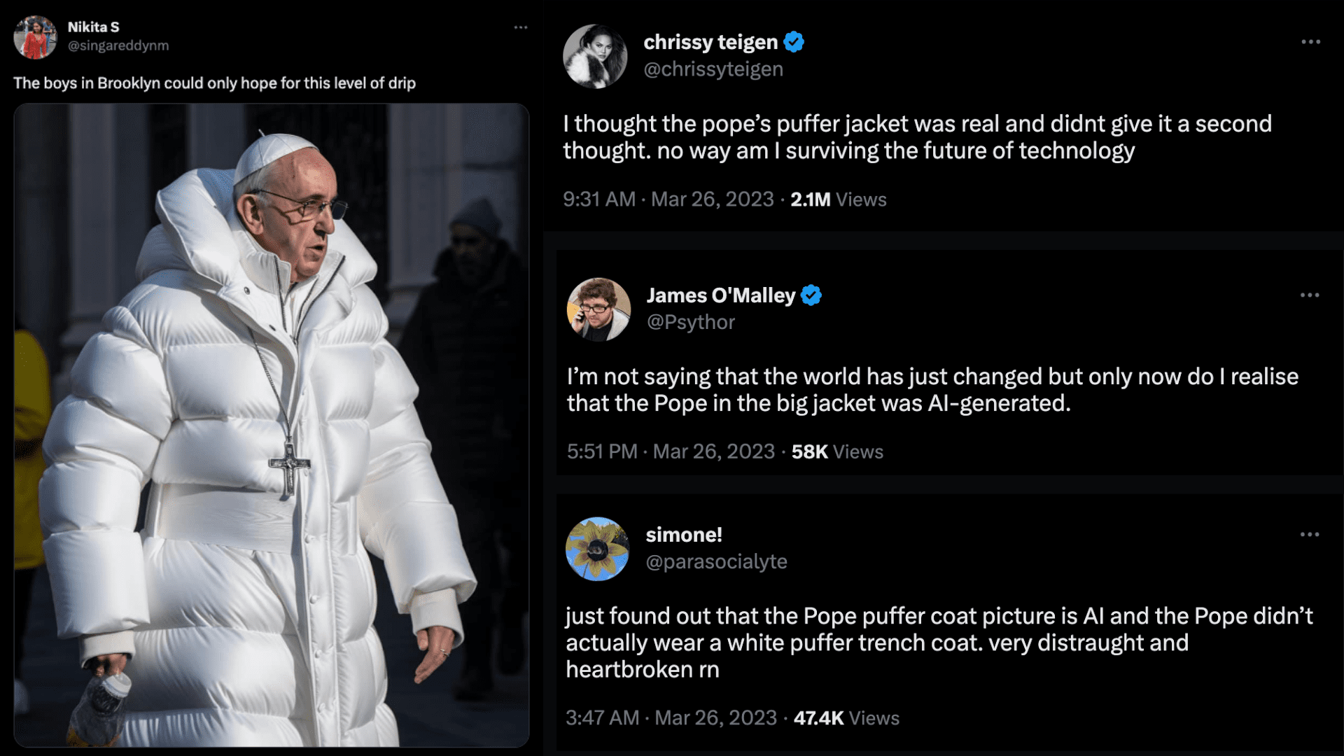 De technologie is zo ver gevorderd dat deze deepfakes zonder deskundige analyse bijna niet meer te onderscheiden zijn van echte content. Weet je bijvoorbeeld nog die door AI gegenereerde deepfake-foto’s van paus Franciscus in een grote witte pufferjas, waar gebruikers vorig jaar online zijn ingetrapt?
