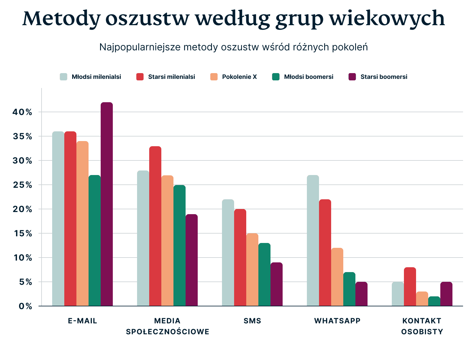 Media społecznościowe nie pozostają daleko w tyle jako wylęgarnia oszustw, zwłaszcza że starsi dorośli stają się bardziej aktywni na platformach takich jak Facebook. Według naszej ankiety, wśród ofiar oszustw w mediach społecznościowych znalazło się 27% osób z pokolenia X, 25% osób z młodszych boomersów i 19% osób ze starszych boomersów.