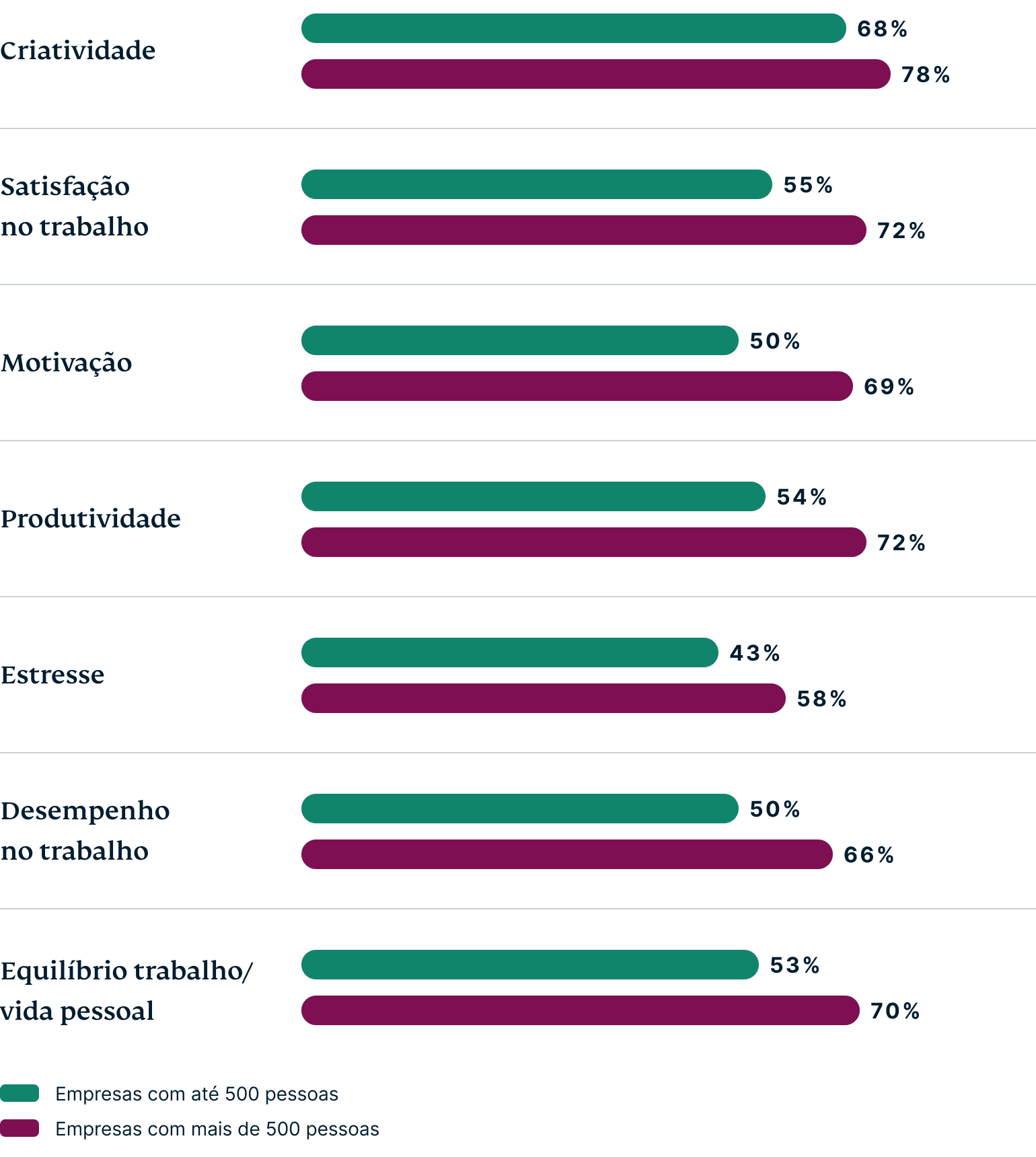 Essa diferença de entusiasmo também pode ser observada quando funcionários e empregadores foram questionados sobre os impactos positivos do metaverso no ambiente de trabalho. Tanto os funcionários quanto os empregadores foram mais propensos a dizer que o metaverso teria um impacto positivo na criatividade, mas, novamente, os empregadores parecem mostrar mais entusiasmo do que os funcionários quando falamos dos impactos positivos.