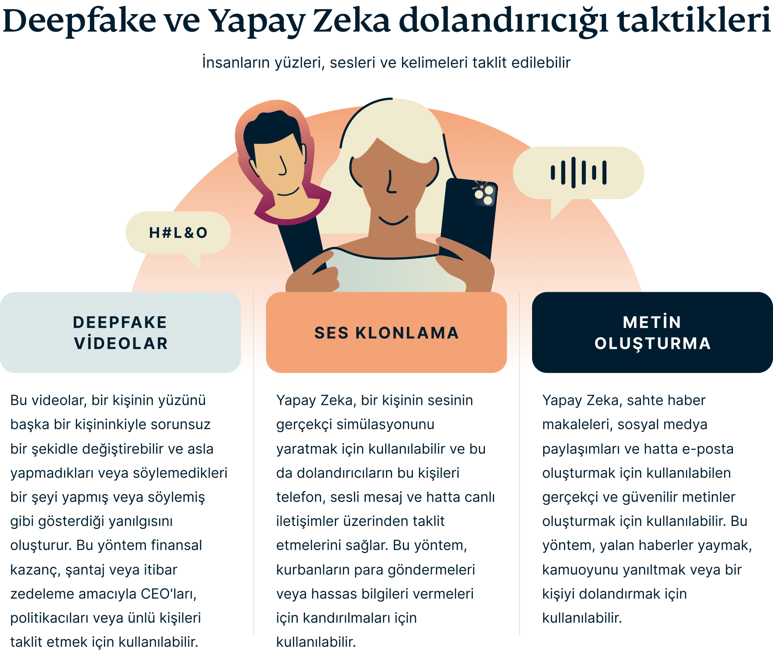 Yapay Zeka veya deepfake dolandırıcılıkları: Deepfake’ler, sahte olsalar bile videoları veya ses kayıtlarını gerçekmiş gibi göstermek için Yapay Zeka’yı kullanır. Dolandırıcılar, sizi yanıltmak için ünlüler destekliyormuş gibi gösterebilir veya sahte ürünler kullanabilir. Bu Yapay Zeka destekli web sitelerinin ve uygulamalarının bazıları da gizli bir şekilde kişisel bilgilerinizi toplayabilir veya zararlı bağlantılara tıklamanız için sizi kandırabilir.