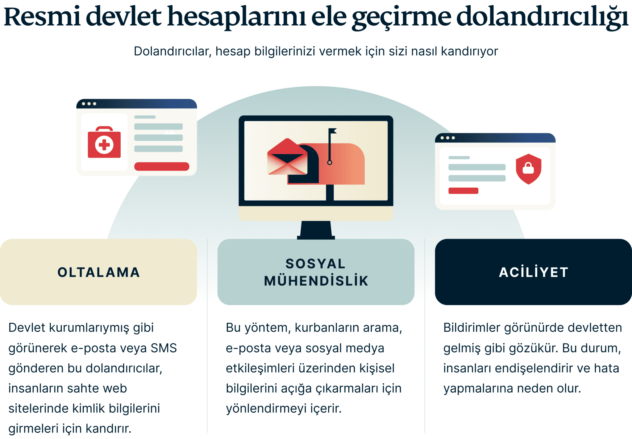 • İhtiyat çok önemli: Devlet kurumlarından beklenmedik bir şekilde gelen, özellikle de hassas bilgileri talep eden veya hızlı eylem isteyen iletişimlerde her zaman dikkatli olun. Birçok dolandırıcı, kullanıcının bilgilerini elde etmek için gerçekmiş gibi görünen oltalama e-postası kullanıyor. Bu tür mesajların gerçekliğini resmi devlet web sitelerini ziyaret ederek veya bilinen, sağlıklı kanallardan kurum ile iletişime geçerek doğrulayın.