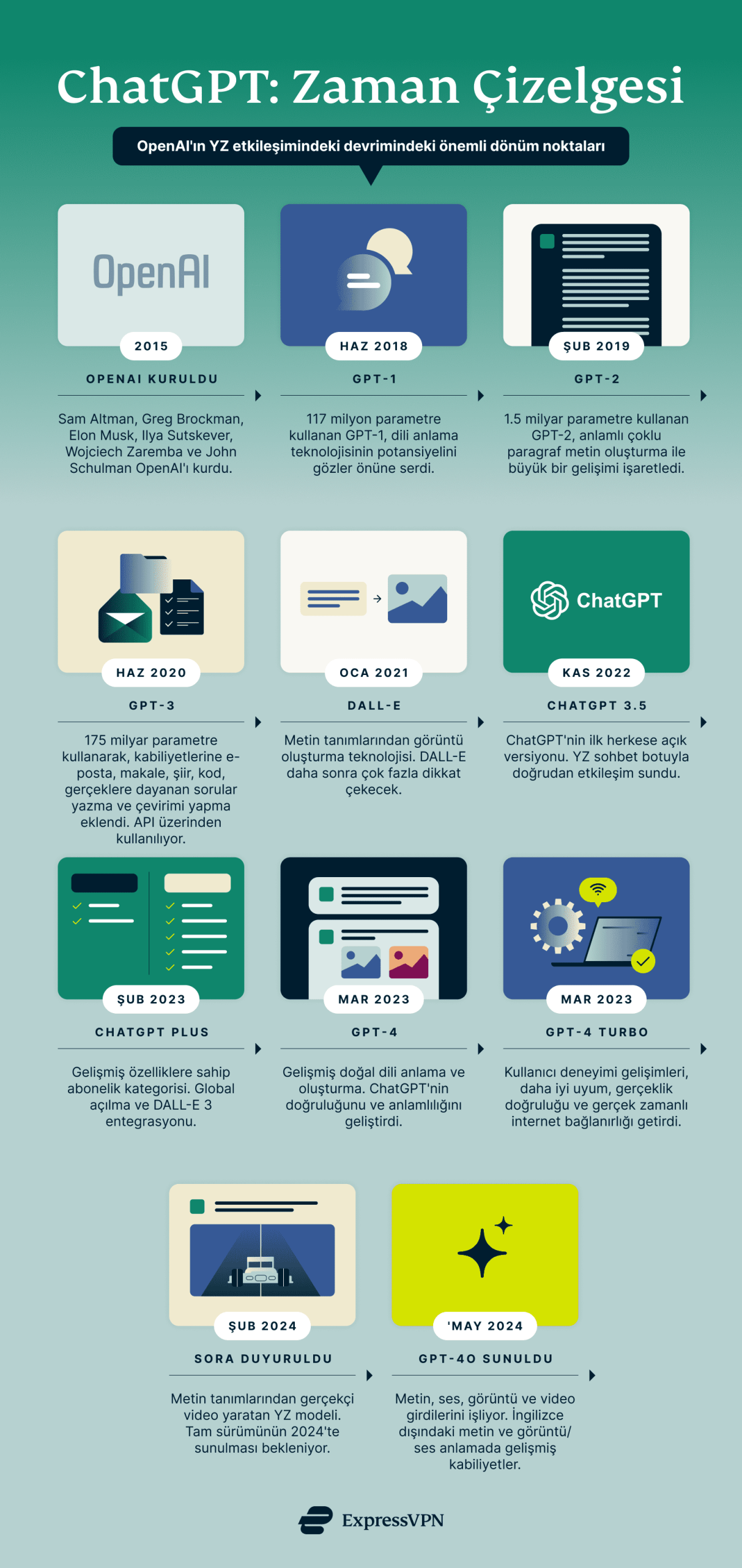 Teknoloji vizyonerleri Sam Altman, Greg Brockman, Elon Musk, Ilya Sutskever, Wojciech Zaremba ve John Schulman’ın buluşu olan OpenAI, 2015’de kurulduğu andan itibaren yapay zeka inovasyonlarında öncülük etti. Kurucu ekip, herkesin fayda göreceği şekilde yapay zekayı geliştirmeye odaklanmış bir organizasyon oluşturmak için teknoloji girişimciliği, makine öğrenimi ve yazılım mühendisliği dallarındaki uzmanlıklarını birleştirdi. Musk artık bu ekipte yer almıyor ancak kendi sohbet botu olan xAI’yi geliştirme üzerine çalışıyor ve Altman ise CEO olarak OpenAI’ya liderlik ediyor.