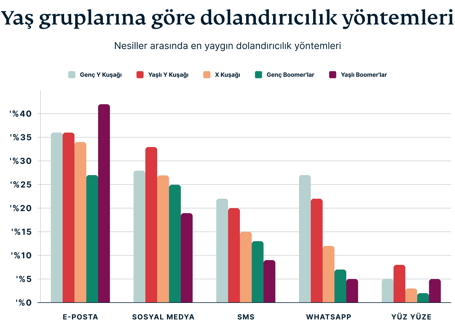 Anketimize göre, Genç Y kuşağının %24'ü ve Yaşlı Y kuşağının %19'u bir aile üyesinin dolandırıcılığın kurbanı olduğunu bildirdi. X kuşağı katılımcılarının yaklaşık %20'si kendisinin dolandırıldığını bildirdi ve bu oran Baby Boomer’lar için dörtte birin (%17) altına düşüyor. 69 yaş ve üstü olanlarda, %16'sı bir dolandırıcılığın kurbanı olmuş.