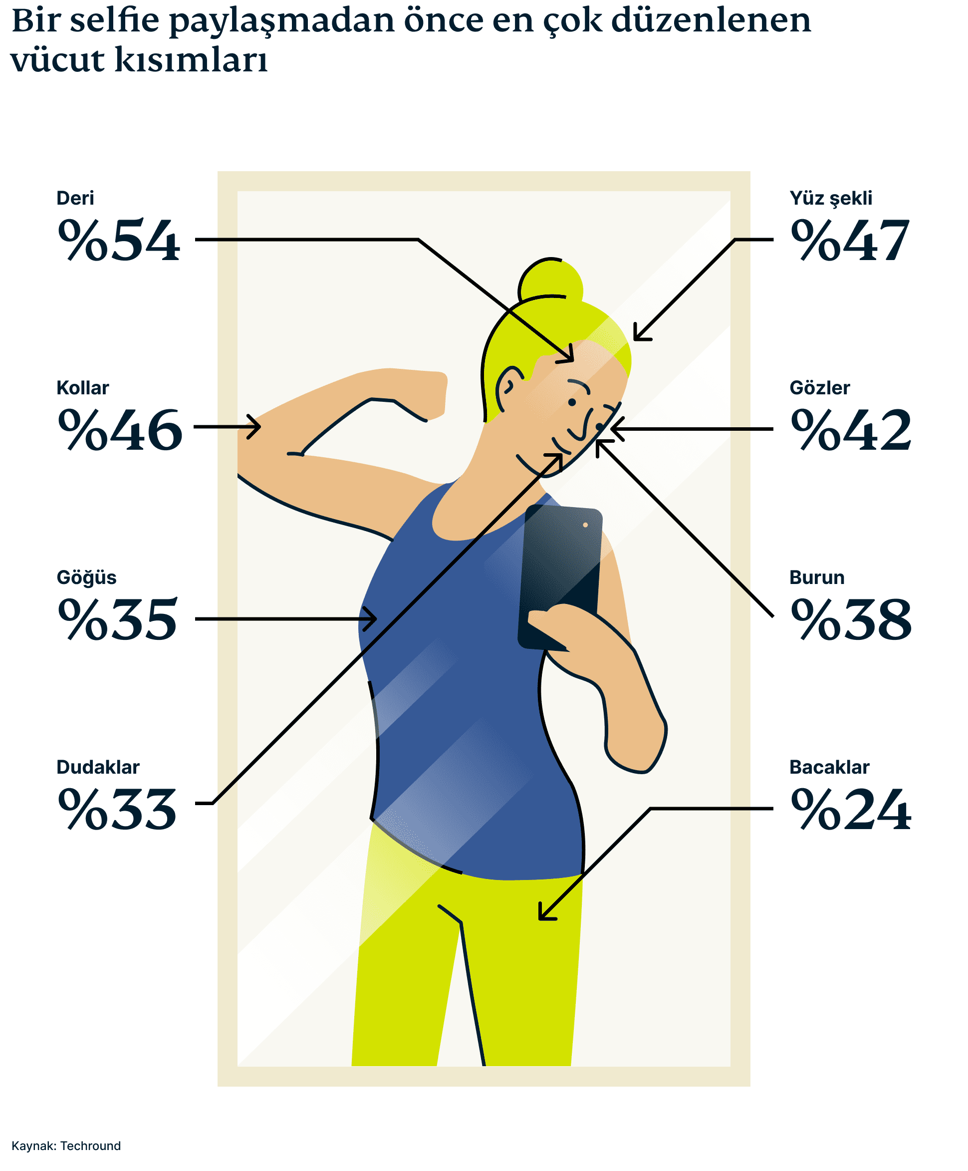 Selfie’lerini düzenleyen kişiler arasında, yaklaşık %8’i bunun için Instagram’ı kullanırken, üçte ikisi Facetune uygulamasını kullanıyor. Bunu, tenlerindeki kusurları kapatmak ve yüz hatlarını değiştirmek için yapıyorlar.