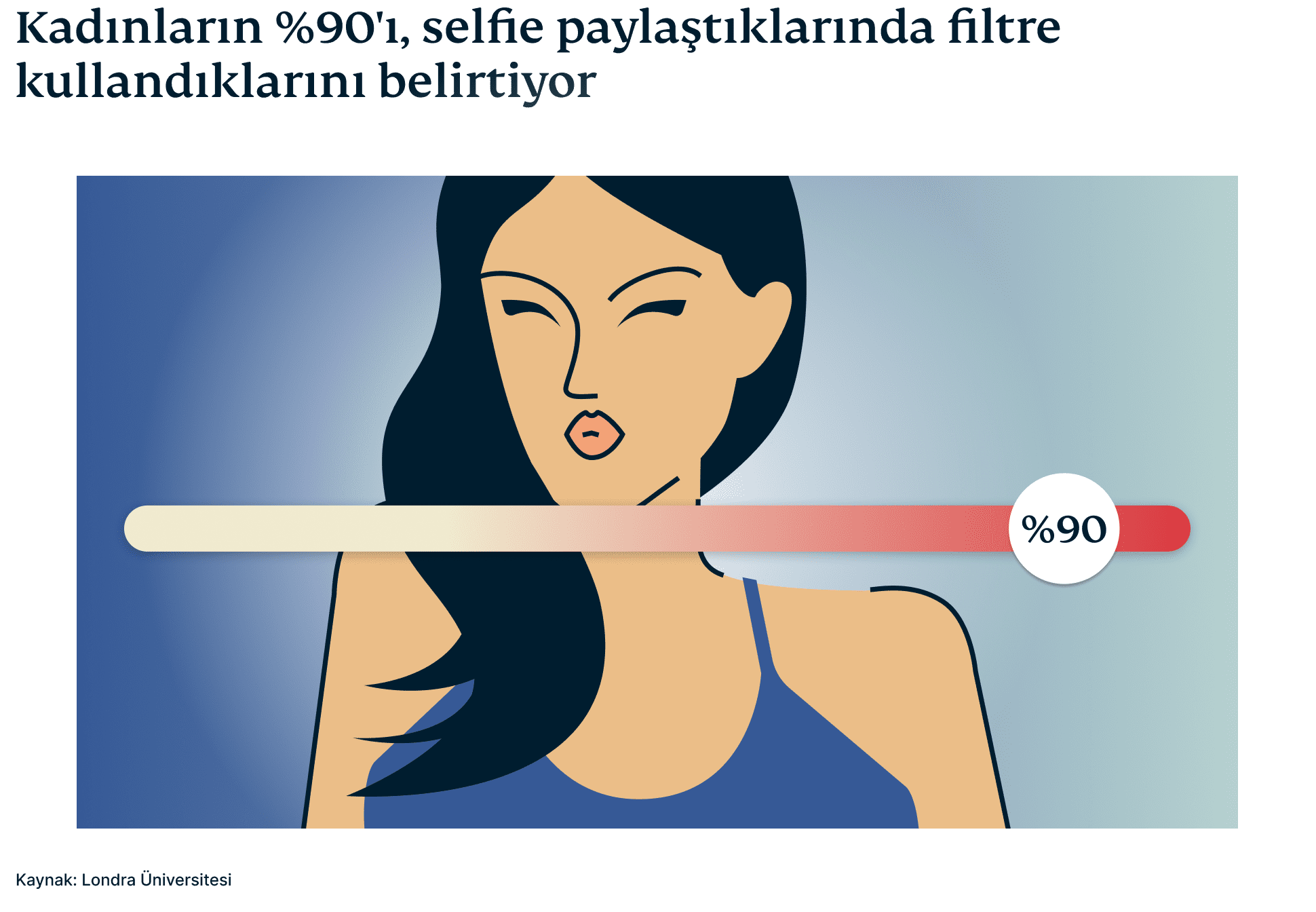 Filtreler de internet üzerindeki görüntülerde önemli bir rol oynuyor. Hem erkekler hem kadınlar, çekiciliklerini artırmak için zaman zaman filtre kullandıklarını kabul etti. Buna karşın, kadınlar en sık filtre kullanan grup oldu ve 10 kadından 9’u sosyal medyada selfie paylaşırken filtrelerden faydalandığını itiraf etti.