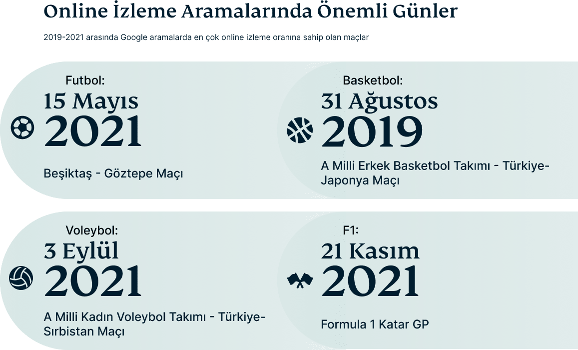 Geçtiğimiz beş yıla dönüp baktığımızda 2019 yılının en çok ve 2017 yılının en az canlı maç izleme aramasına sahip yıl olduğunu görüyoruz. Her yıl en çok canlı maç izleme aramasına sahip günler grafikte futbol topu ikonu ile işaretlenmiştir ve bir futbol maçını temsil etmektedir.