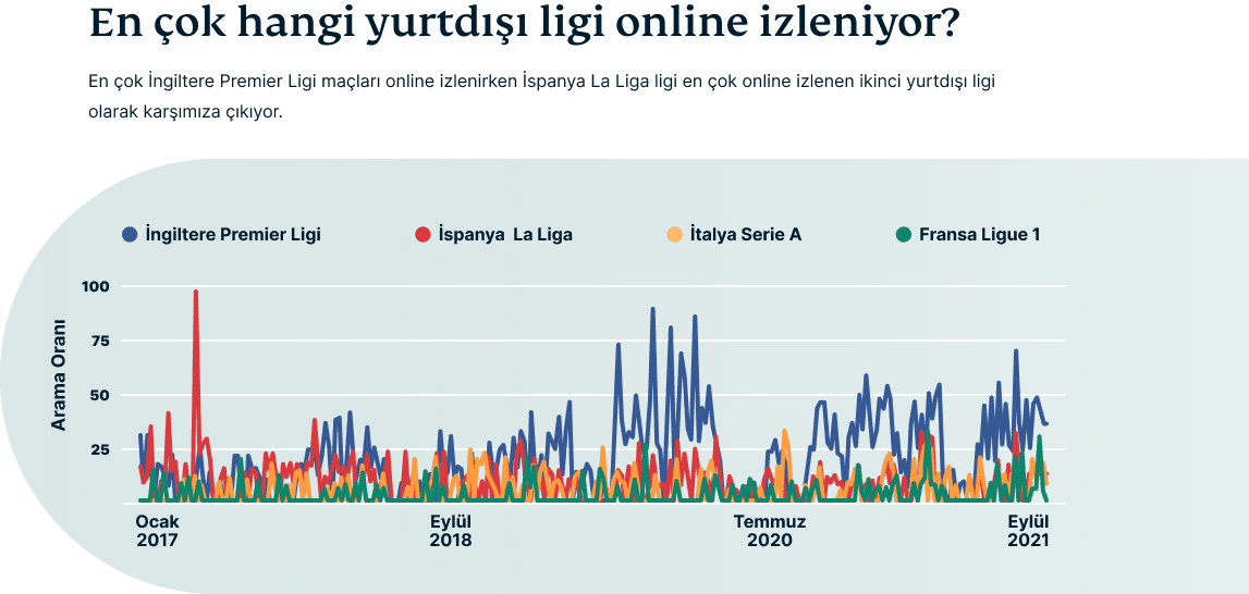 Sporseverlerin online maç izleme eğilimleri bize başka ne anlatıyor? Milli takım karşılaşmaları söz konusu olduğunda akan sular duruyor gibi gözüküyor. Türk sporcuların yer aldığı yurtdışı ligleri kesinlikle daha çok ilgi çekiyor ve online izleme aramalarına yansıyor.